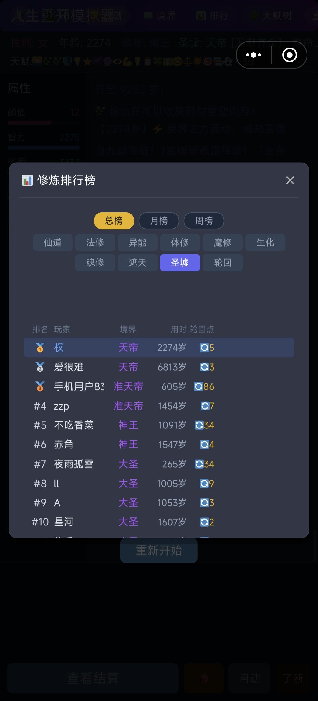 收集还魂草5株后,人鬼两道双修,花粉路太有天赋了,没多久就成了天帝,就是鬼道没天赋太弱了,渡劫10%一直失败,人麻了,还好有天帝修完庇护