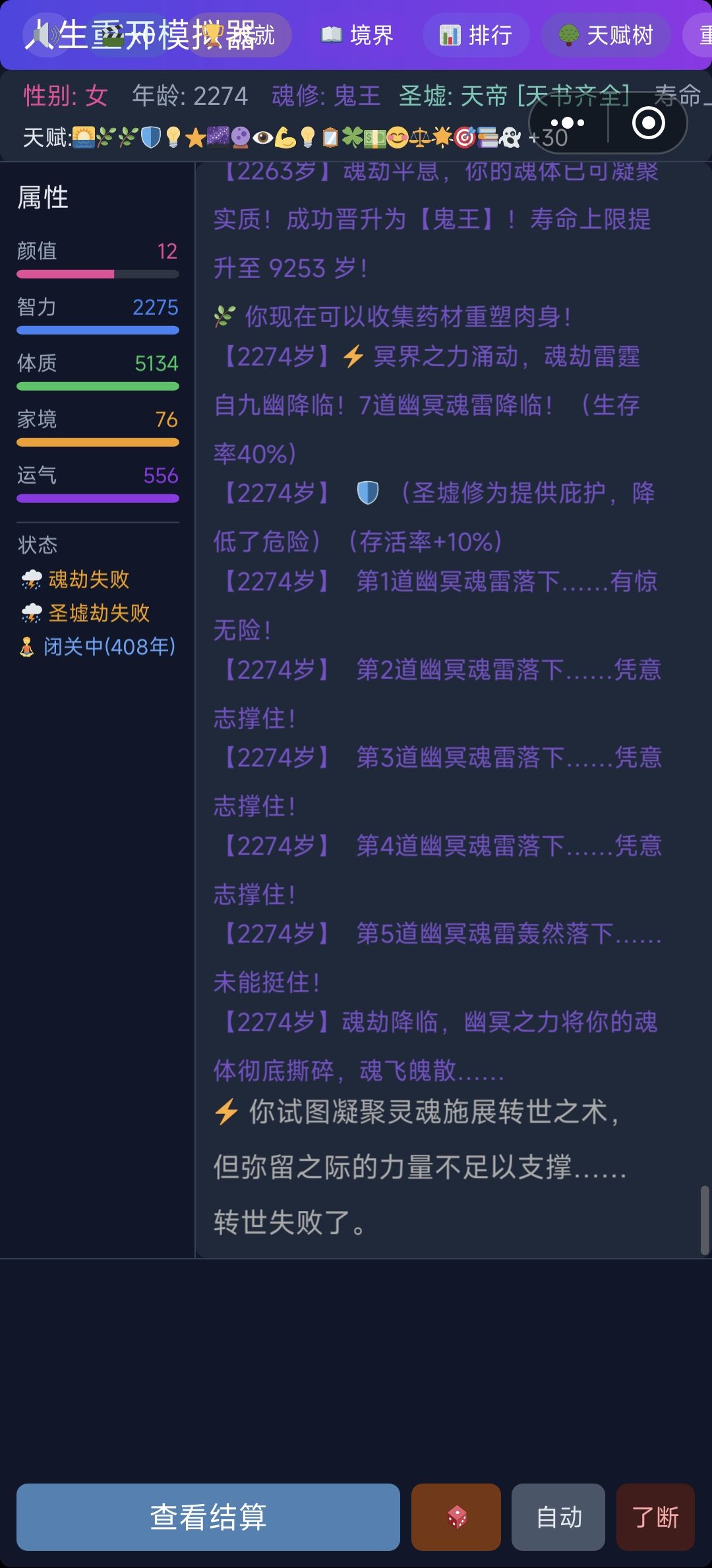 后边就是一直渡劫失败,修为减半,最后10%成功率的鬼道雷劫都过了,无缝衔接下一个雷劫,直接给我劈死了,这40概率没成算我运气不好