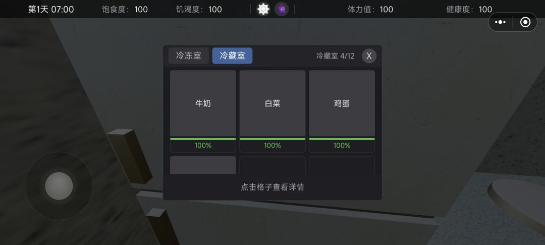 游戏对日常生活的模拟达到了一种令人意外的颗粒度。冰箱分冷藏室(12格)和冷冻室(6格),食物有新鲜度衰减,变质食物吃了会食物中毒。厨房台面只能放6样食材,做饭分简单(一个食材)、家常(两个食材)、大餐(三个食材)三档。一碗番茄炒蛋能恢复35点饱食度和28点体力,但你得先有番茄和鸡蛋,而且它们不能放太久。