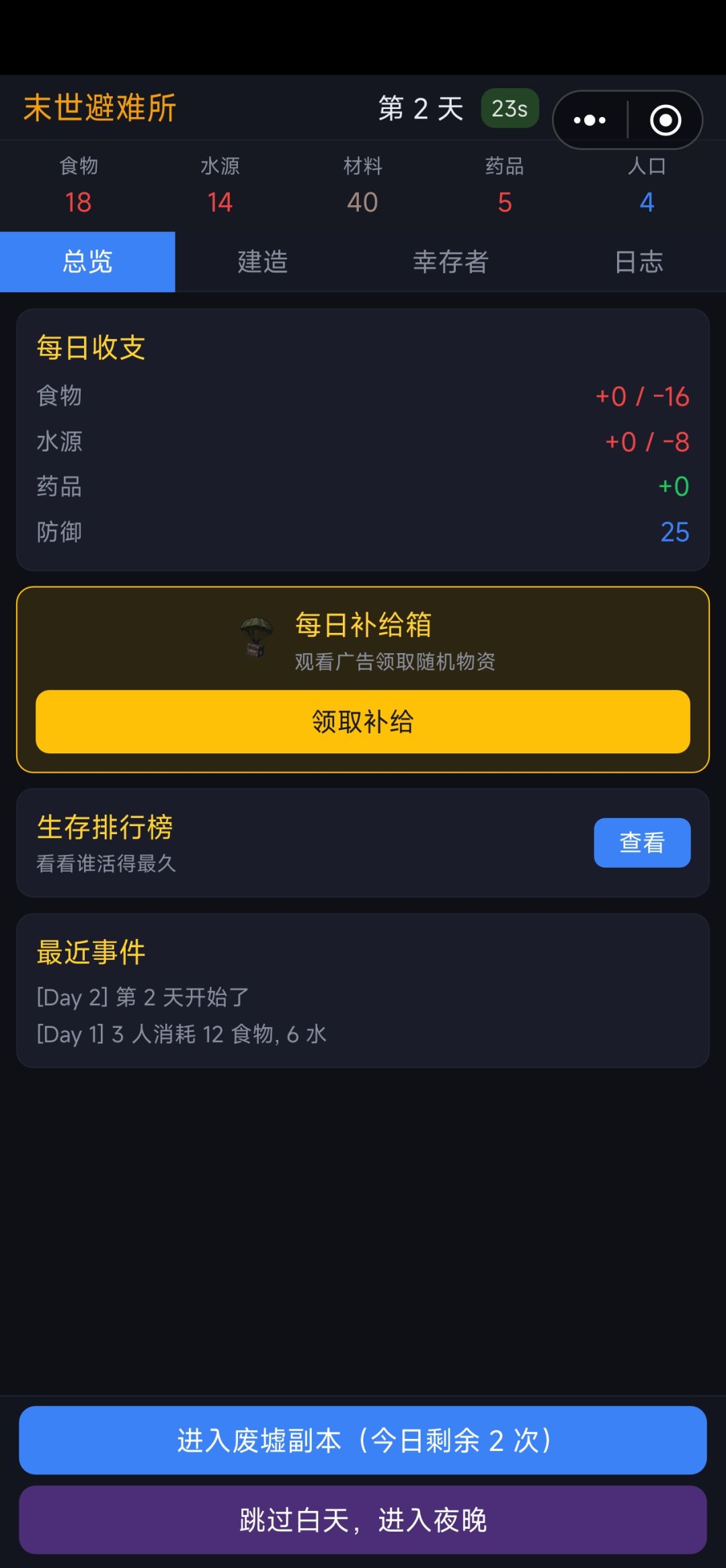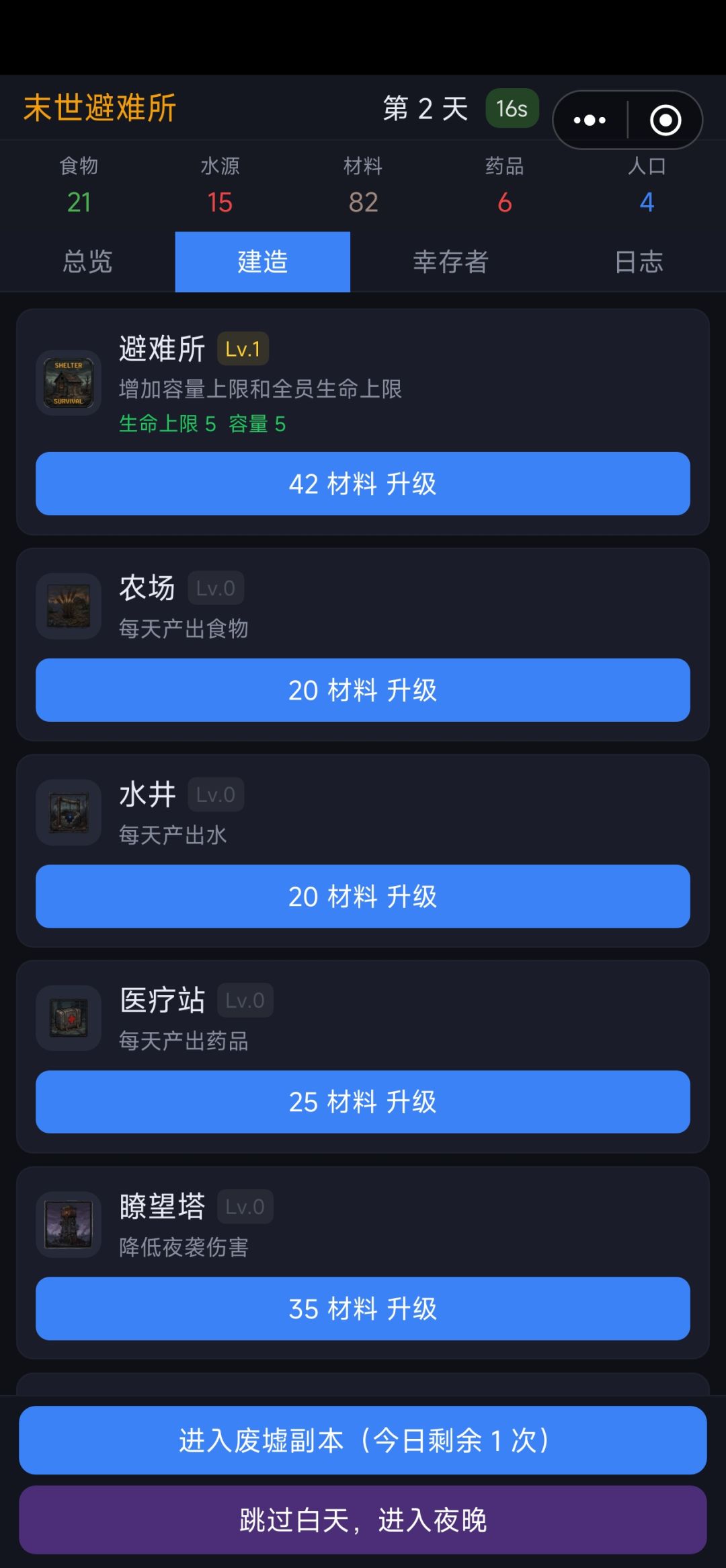 这游戏把末世生存的压迫感做得很到位。开局30食物20水,每日净亏6食物3水,资源倒计时从第一天就开始滴答响,逼着你必须在温饱与安全之间做出取舍——是优先升农场水井稳住基本盘,还是攒42材料升避难所扩容,或者35材料建防御塔应对尸潮?没有标准答案,每一步选择都有连锁反应。