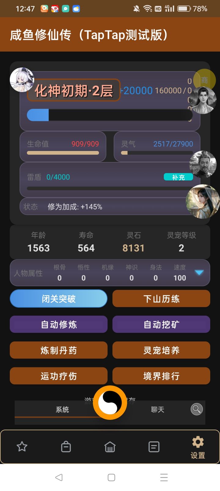 注:第一世,不会玩,靠着新手送的1000%闭关经验buff硬搞到化神了,但就是无脑搞修为闭关,堂堂化神老怪,体质悟性等五维都是0,法宝啥也没有,功法全都没练,就是一个空有境界的白板。