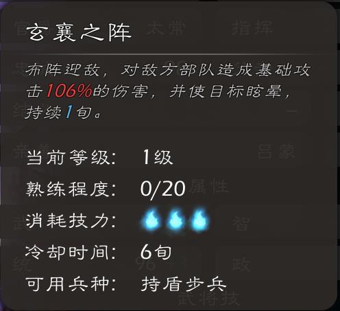 布阵迎敌,对敌方部队造成基础攻击106%的伤害,并有几率使目标眩晕,持续1旬。