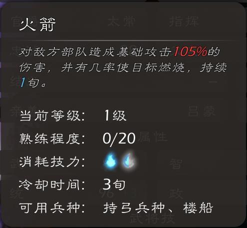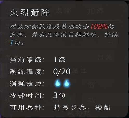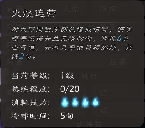 对大范围敌方部队造成伤害,伤害随等级提升且无视防御,降低6点士气值,并有几率是目标燃烧,持续2旬。