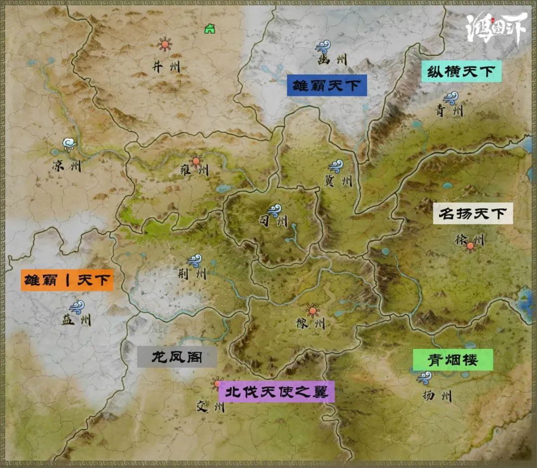 10月27日17点,各大势力纷纷崛起,分别是扬州的【青烟阁】,徐州的【名扬天下】,青州的【纵横天下】,幽州的【雄霸天下】,益州的【雄霸丨天下】,交州的【北伐天使之翼】以及【龙凤阁】。凉州由于新玩家较多,并无十分突出的联盟。