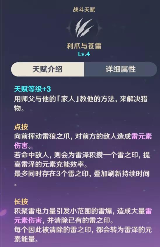 重击转圈圈会消耗大量体力而且开启大招后无法使用重击,在实战中一般使用普攻即可。雷泽突破加成30%物理伤害,同时在雷泽的伤害中物理伤害比雷伤占比更多,所以雷泽一般都是以物理流派为主。